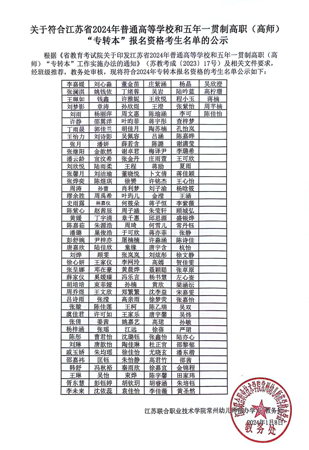 关于符合江苏省2024年普通高等多盈(中国)和五年一贯制高职( 高师 )“专转本”报名资格考生名单的公示 2024年01月08日 16:51 点击:[] 上一条:多盈平台登录手机多盈在线客户端信息化及网安运维服务项目竞争性磋商公告 下一条:2024届学前教育与托育专业毕业生联合网络双选会 【关闭】