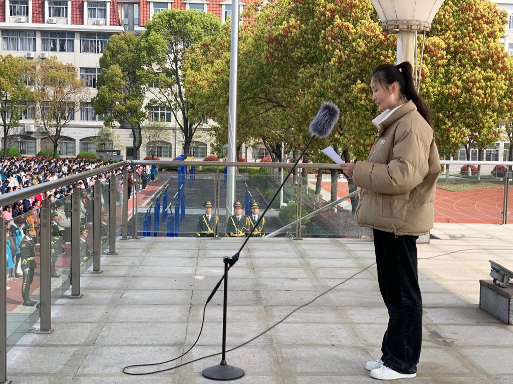 3月27日,迎着春日的朝阳,伴着激昂的国歌,全体师生在篮球场上聆听了以“爱国爱党铭于心,爱校爱己践于行”为题的国旗下演讲,本次演讲者为第十一届江苏省师范生基本功大赛一等奖获得者蒋梦冉同学。