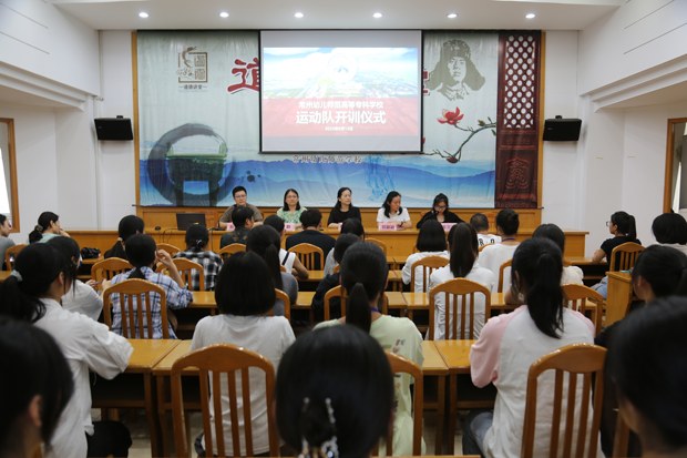 9月13日下午,校运动队(篮球队、田径队、健美操队)开训仪式在1号楼6楼道德讲堂举行。副校长杨丽萍、教务处主任顾静、体育教研室主任郭颖颖及各运动队教练运动员参加本次活动。活动由教务处副主任殷荣荣主持。