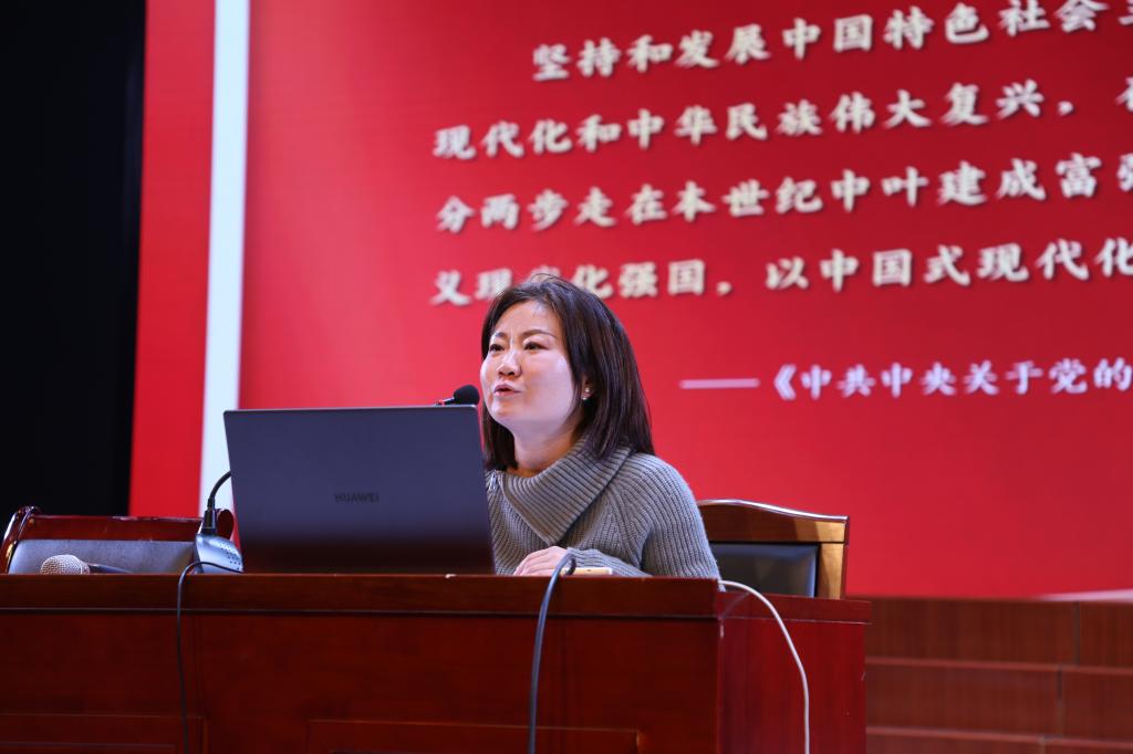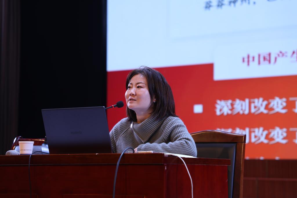 王伟老师围绕“为什么说实现中华民族伟大复兴成功了不可逆转的历史进程”、“中国式现代化是一个怎么样的现代化”两个核心问题向与会学生介绍,在党的二十大上,提出建设中国式现代化,并且阐述了中国式现代化的优势与必要性,是实现第二个百年奋斗目标和推进中华民族伟大复兴的必要历程。