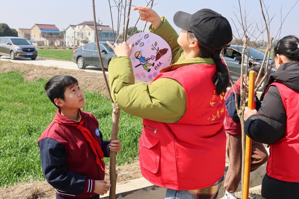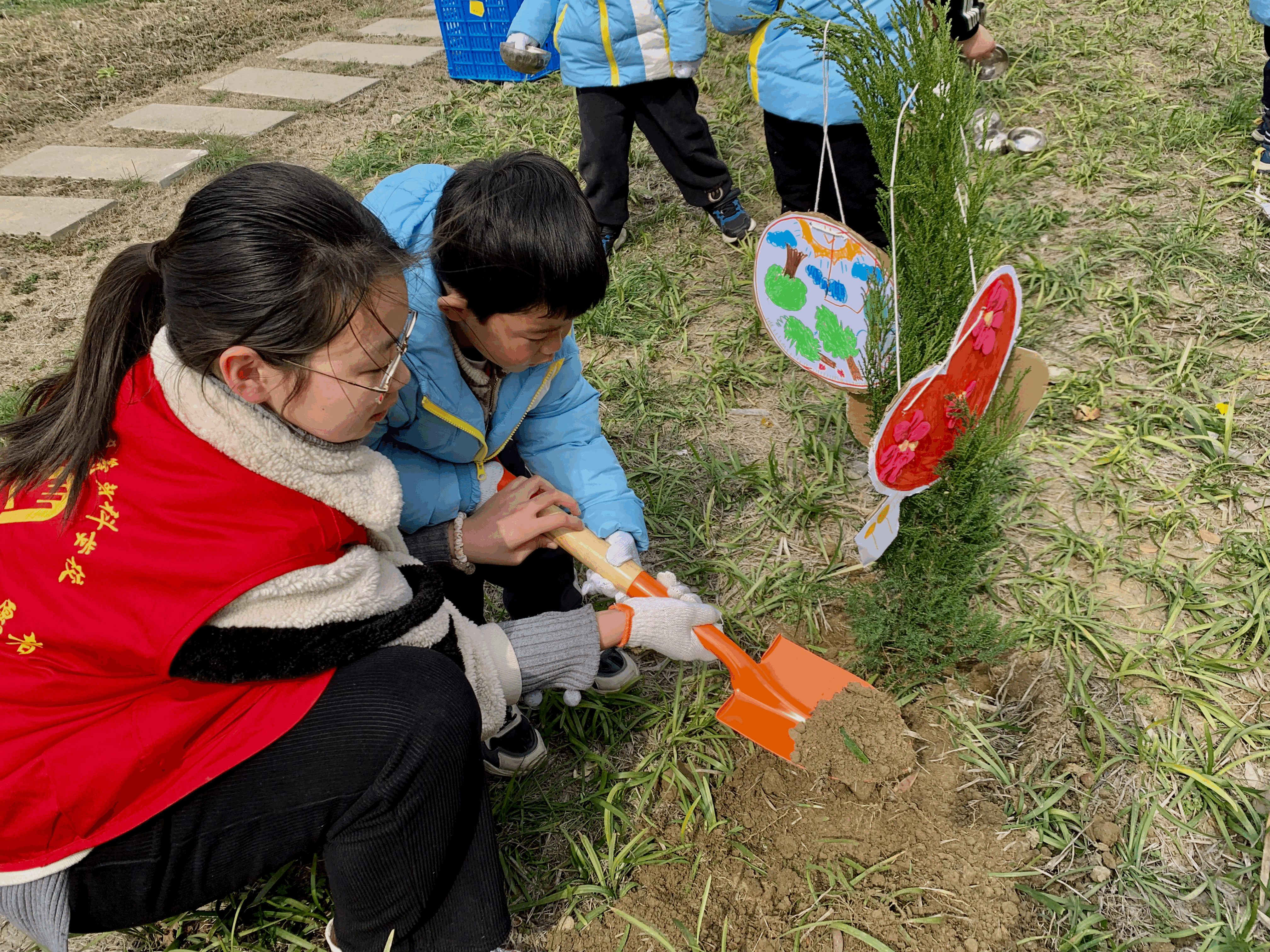 植树现场,志愿者和小朋友们分工协作,挖坑、栽植、培土每个环节都衔接有序、一丝不苟,满怀热情地种下“青年树”。他们一起手拿铲子、水桶等工具,为树木浇水、松土,并在栽好的树苗上挂上自己的专属小卡片,小小的卡片寄托着小朋友们的期待,在他们的心底埋下了保护生态的种子。