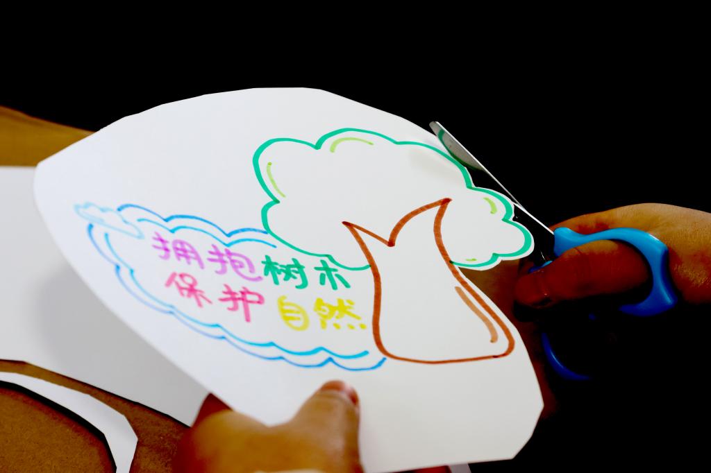 在志愿者的协助下,活动进入到第二环节——手工树牌DIY。从选材到构图,从绘画到裁剪,小朋友和大朋友们用自己的巧手和多彩的画笔一丝不苟地进行创作,孩子们充分发挥想象力和创造力,创作出绘有各种奇特花草或是鲜艳蝴蝶的树牌作品。