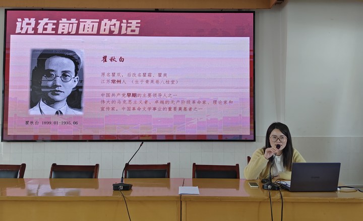 余嫚老师指出,瞿秋白虽然牺牲了,但他由翻译的《国际歌》及其蕴含的精神却流传下来,成为他生命的另一种延续;瞿秋白同志的信仰与理想、责任与担当、风骨与气节,不仅在历史的天空璀璨夺目,而且在中华民族从站起来富起来到强起来的新时代,依然闪烁耀眼的光芒。