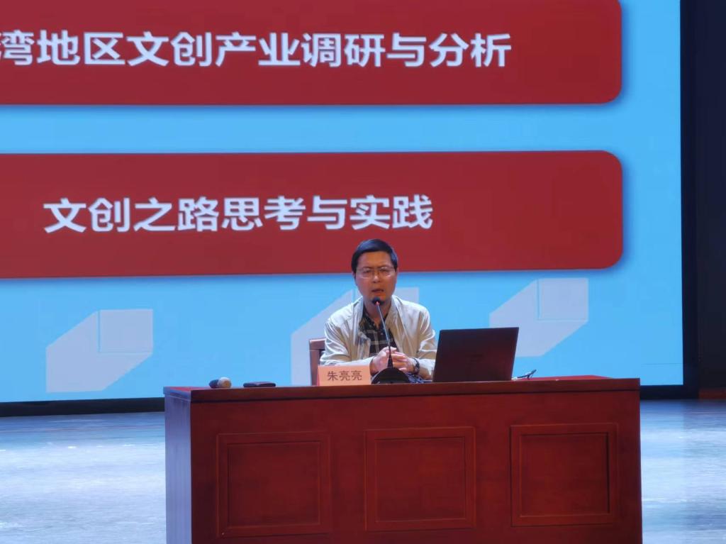 朱教授解读了美育实践与文创产业的关系,提出文创产业是实现美育实践的有效途径之一。他以自己在台湾访学和进行学术交流的亲身经历,阐述了台湾文创产业的特性,并用多个案例展示台湾文创产品的差异化和品牌营销的融合化。朱教授以“龙泉青瓷”主题文创在海峡两岸的实践为切入点,探讨文创产业发展的路径,他指出文创产业要兼顾文娱性与在地性,勇于跨界合作融合创新,同时要保持情怀积极原创。他希望同学们要尽早设定目标、努力追求,为文化创意产业添砖加瓦。
