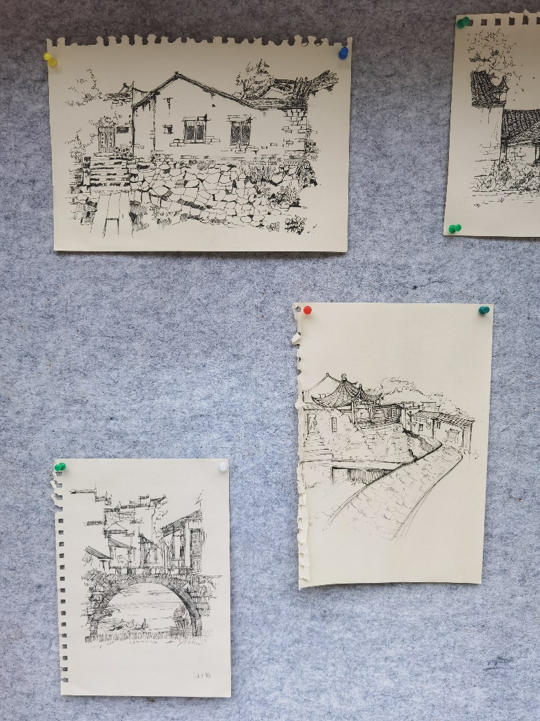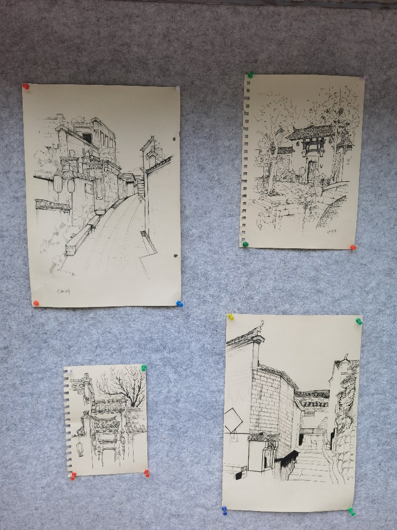 活动结束后,学生们根据老师们的点评和指导,不断修改完善自己的作品,并在多盈(中国)乐艺园举办了查济写生作品展。构图巧妙、线条流畅的速写画描绘了徽派建筑的古色古香,惟妙惟肖、五光十色的摄影作品尽显出徽州古村落的徽风皖韵。