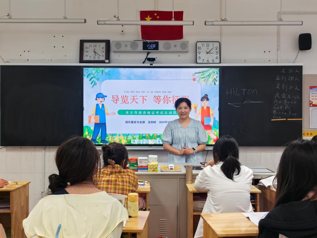 9月11日下午,现代服务专业部正式启动2024年全国导游资格考试动员活动。专业部主任吴科岭面向旅游管理20级学生做了“导览天下,等你征服”为主题的英文导游资格考试动员,旨在激励大家登上导游职业的国际舞台。党支部书记、副主任孙大兴面向旅游管理21级学生做了“激发潜能,点燃梦想”为主题的中文导游资格考试动员,着重激发学生的内在动力与职业憧憬。班主任谈鹭飞、肖婧老师在现场积极协同,确保动员活动顺利进行。