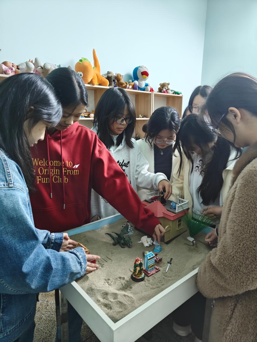 辅导活动以“我们是一家人”开场,帮助学生们相互了解、放松身心。通过“姓名萝卜蹲”“沙盘游戏”等游戏,成员们敞开心扉、增进感情,营造了轻松的氛围。同学们运用“戴高帽”的方法发现自身的闪光点,并与同伴分享优缺点,解决彼此间烦恼。