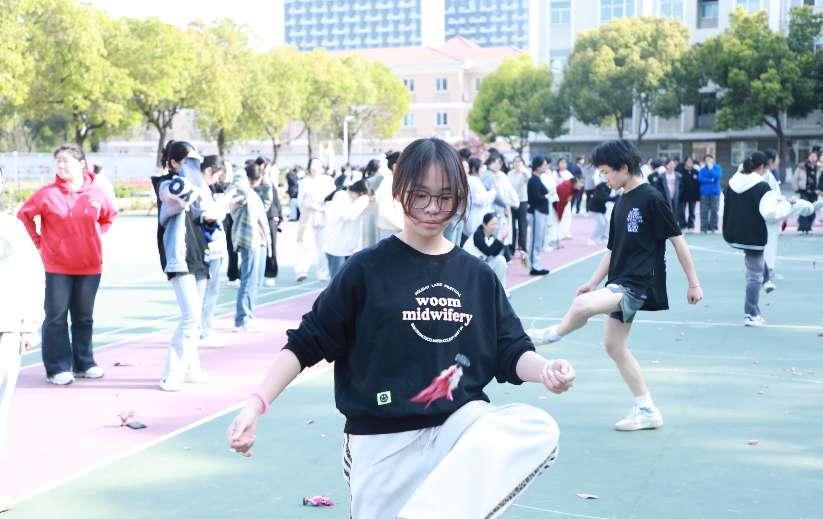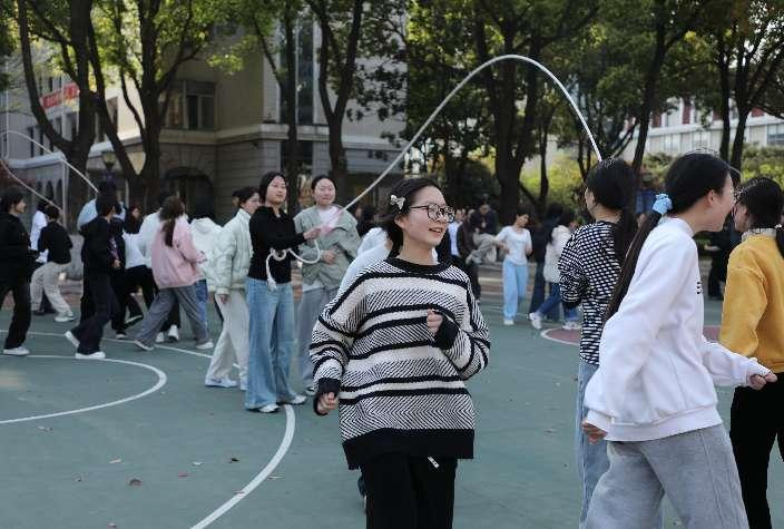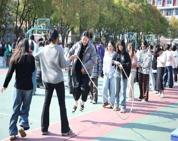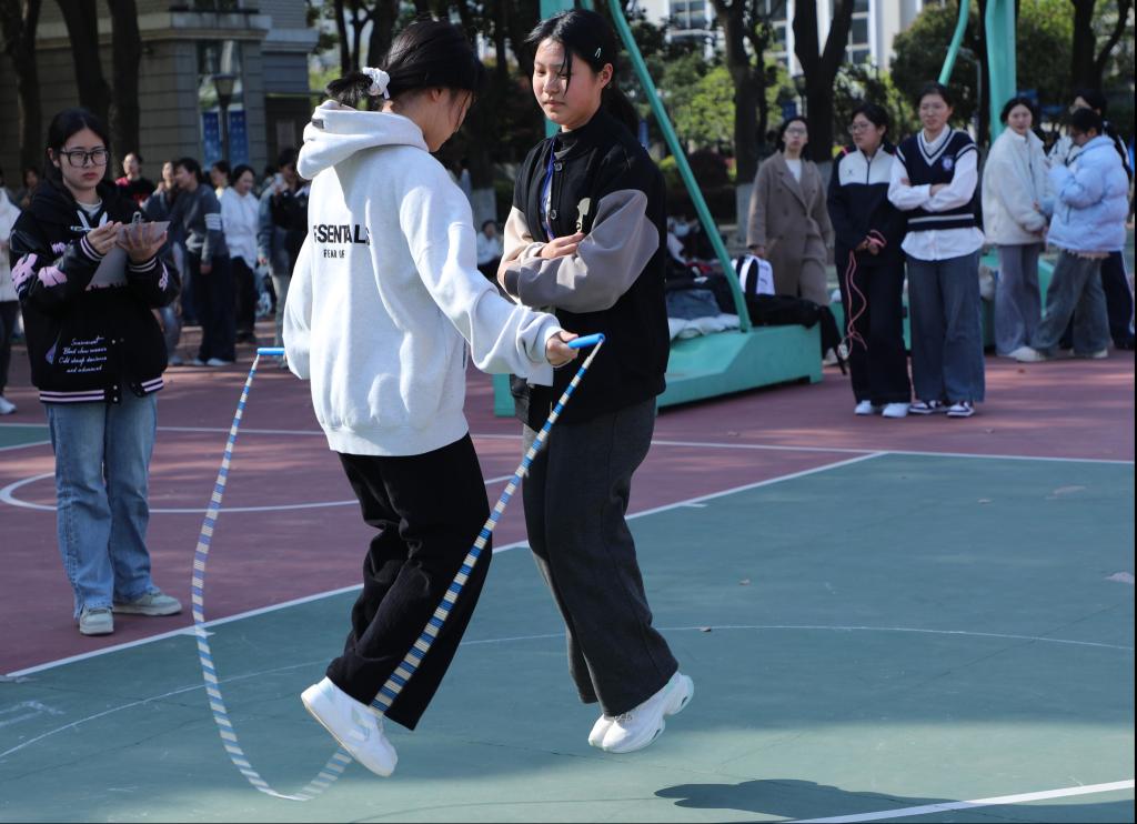 本次比赛分为一带一单摇跳、毽子盘踢、双摇跳、10人绕“∞”字跳长绳四个项目,现场气氛热烈。在一带一单摇跳项目中,选手两人一组,配合默契,展现出了极佳的协作能力;参加毽子盘踢的选手们将毽子控制得游刃有余;双摇跳项目极具挑战性,选手们在快速跳跃的同时完成双摇动作;10人绕 “∞” 字跳长绳项目更是将比赛推向了高潮,各组同学紧密配合,依次进入长绳,动作流畅自然,展现出了团队强大的凝聚力。