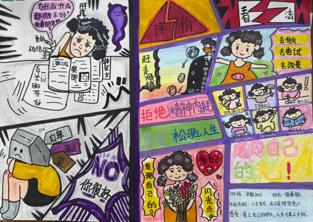 在“情境漫画”主题下,同学们将内心的情绪、情感和思考转化为线条与色彩,展现了当代青年对心理健康的积极态度。有的作品以朋友间的温情对话诠释关怀互助的真谛,有的作品借日常琐事中的灵感顿悟传递自我疗愈的力量。