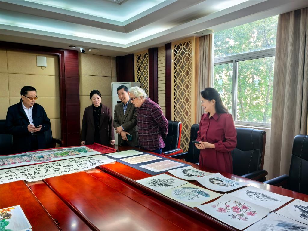 活动现场,美术教研室主任刘文君老师精选了师生书法、国画作品进行展示。书画研究会的老艺术家们细致观摩了师生作品,给予了高度认可,并从笔法、构图、色彩、意境等方面提出了专业建议,分享了宝贵的艺术创作经验。